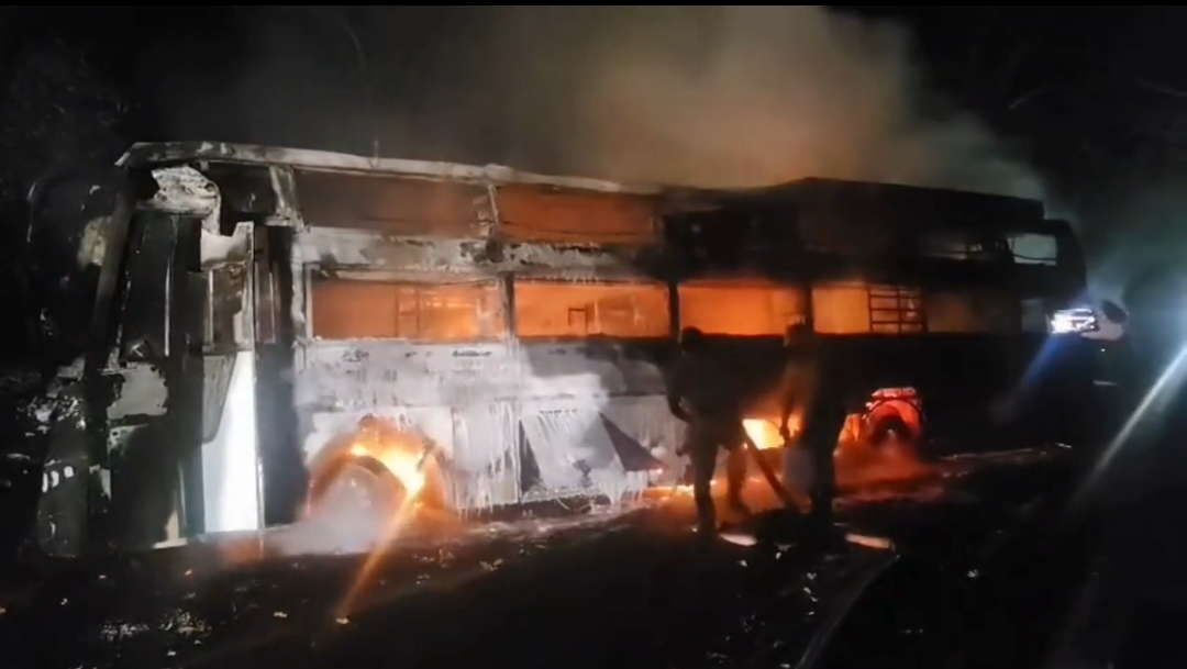 ಶಿವಮೊಗ್ಗ ಜಿಲ್ಲೆಯ ಹೊಸನಗರ ತಾಲೂಕಿನ ಸೂಡುರು ಬಳಿ ನಸುಕಿನ ವೇಳೆ ಶ್ರೀ ಅನ್ನಪೂರ್ಣೇಶ್ವರಿ ಟ್ರಾವೆಲ್ಸ್ ಹೆಸರಿನ ಖಾಸಗಿ ಸ್ಲೀಪರ್ ಬಸ್ ಅಗ್ನಿಗಾಹುತಿಯಾಗಿದೆ. ನಿಟ್ಟೂರಿನಿಂದ ಬೆಂಗಳೂರಿಗೆ ಹೊರಟಿದ್ದ ಈ ಬಸ್ನಲ್ಲಿ ಅರಸಾಳು ಮತ್ತು ಸೂಡೂರು ಗ್ರಾಮಗಳ ನಡುವೆ ಬೆಂಕಿ ಕಾಣಿಸಿಕೊಂಡಿದ್ದು, ಇದನ್ನು ಗಮನಿಸಿದ ಬಸ್ ಚಾಲಕ ಕೂಡಲೇ ಬಸ್ ನಿಲ್ಲಿಸುವ ಪ್ರಯತ್ನ ಮಾಡಿದಾಗ ಬಸ್ ಮರಕ್ಕೆ ಡಿಕ್ಕಿ ಹೊಡೆದಿದೆ ಎನ್ನಲಾಗಿದೆ.