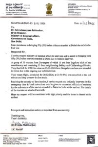 ವಿಷಯ ತಿಳಿಯುತ್ತಿದ್ದಂತೆಯೇ ಕಾರ್ಯಪ್ರವೃತ್ತರಾದ ಸಂಸದೆ ಡಾ. ಪ್ರಭಾ ಮಲ್ಲಿಕಾರ್ಜುನ ಅವರು, ಮಾರ್ಚ್ 1ರಂದು ಕೇಂದ್ರ ಸಚಿವರಿಗೆ ತುರ್ತು ಪತ್ರ ಬರೆದಿದ್ದಾರೆ. “ಮಧ್ಯಪ್ರಾಚ್ಯದ ಯುದ್ಧದ ಪರಿಸ್ಥಿತಿಯಿಂದಾಗಿ ನಮ್ಮ ಭಾಗದ ನಾಗರಿಕರು ಸಂಕಷ್ಟದಲ್ಲಿದ್ದಾರೆ. ದುಬೈನಲ್ಲಿರುವ ಭಾರತೀಯ ರಾಯಭಾರ ಕಚೇರಿ ಅಧಿಕಾರಿಗಳೊಂದಿಗೆ ಸಮನ್ವಯ ಸಾಧಿಸಿ, ಪ್ರವಾಸಿಗರ ಸುರಕ್ಷತೆ ಹಾಗೂ ಶೀಘ್ರ ವಾಪಸಾತಿಗಾಗಿ ಅಗತ್ಯ ಕ್ರಮ ಕೈಗೊಳ್ಳಬೇಕು” ಎಂದು ಪತ್ರದಲ್ಲಿ ಒತ್ತಾಯಿಸಿದ್ದಾರೆ.